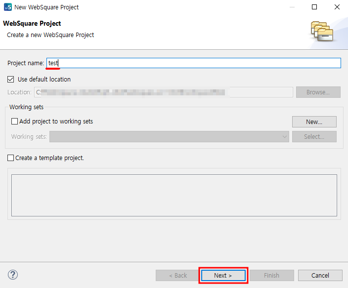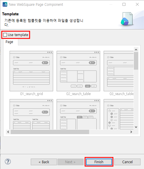 ③ Use template 체크박스를 체크하여 템플릿을 선택한 후 Finish를 해도 되고 바로 Finish를 해도 됨