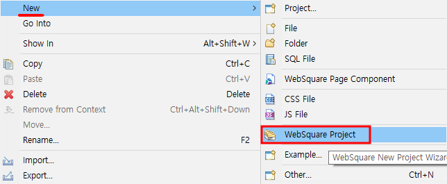 ① WebSquare5 실행 후 package explorer 오른쪽 마우스 > New > WebSquare Project