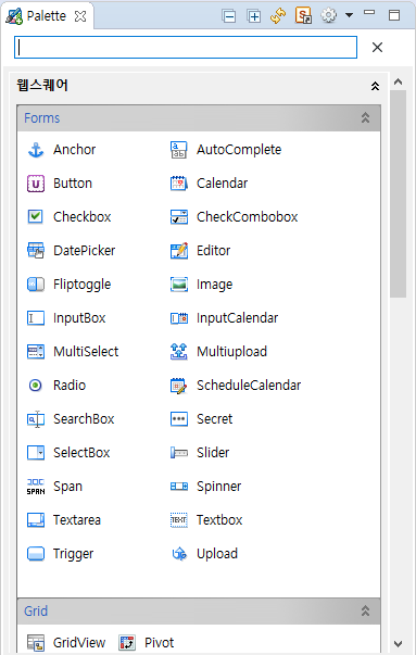 WebSquare5에서 제공하는 컴포넌트와 UDC, TTC, Snippet을 한 눈에 확인할 수 있다.
