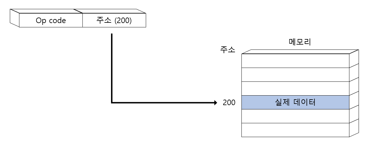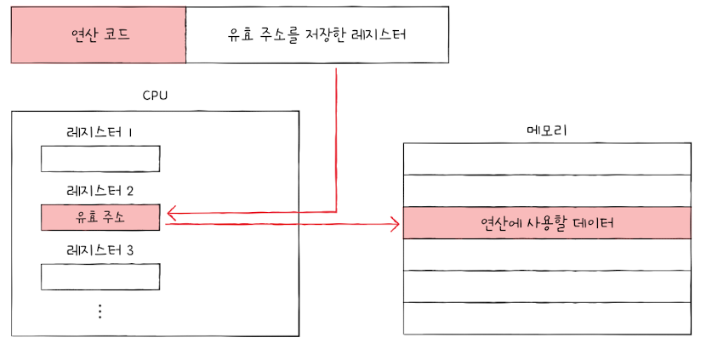- 연산에 사용할 데이터를 메모리에 저장하고 그 주소(유효 주소)를 지정한 레지스터를 오퍼랜드 필드에 명시하는 방법