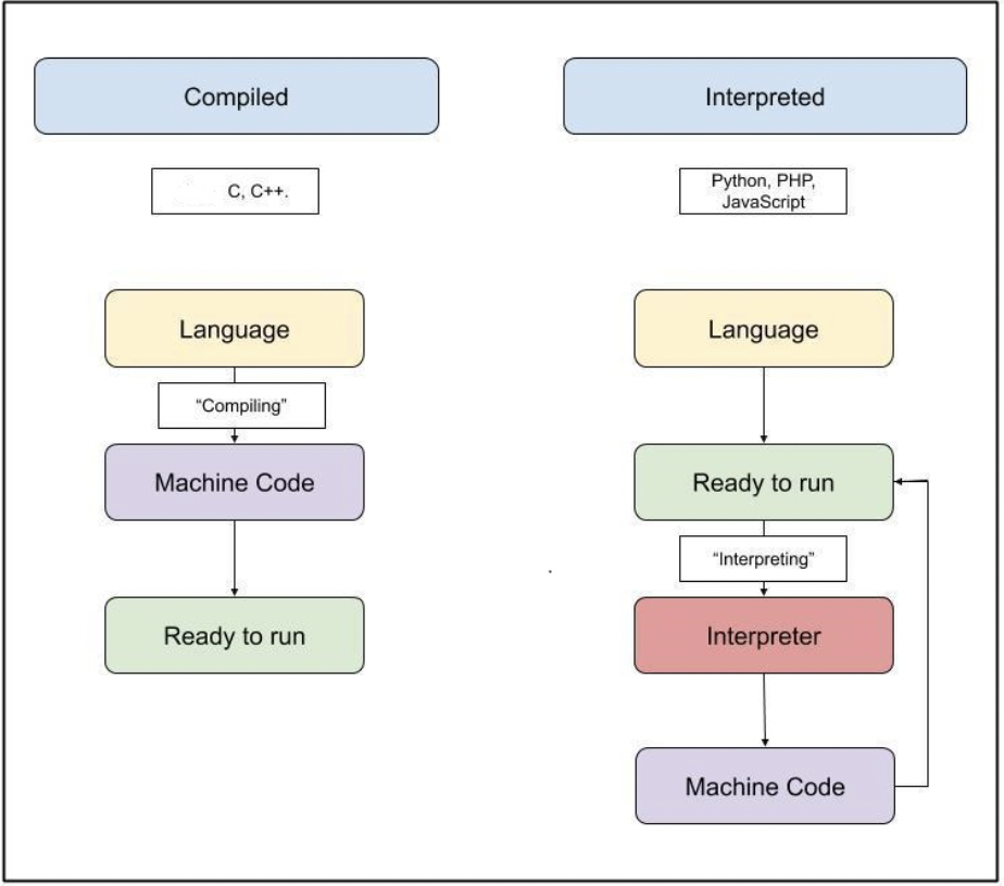 ✔️ 컴파일을 통해 나온 목적 코드는 컴퓨터가 이해하고 실행할 수 있는 저급 언어인 반면, 인터프리터 언어는 소스 코드 마지막에 이를 때까지 한 줄씩 저급 언어로 해석하며 실행하기 때문에 일반적으로 인터프리터 언어가 컴파일 언어보다 느림!